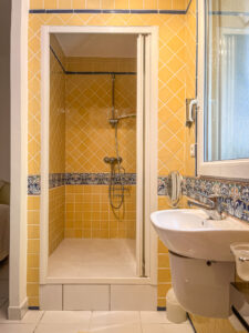 À l’autre extrémité de la maison, cette chambre occupe une aile plus “privative” du premier étage, garantissant une tranquillité absolue. Elle ouvre à la fois sur la piscine et sur la douceur apaisante du jardin. Vous pourrez profiter de sa petite terrasse qui surplombe la piscine. Elle dispose d’une salle de douche attenante avec douche à l’italienne.